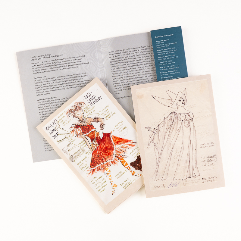 Postkaardikomplekt “Laena mulle värve, Vanemuine!” – teatri “Vanemuine” 140 juubeliks välja antud postkaardikomplekt teatri kostüümi- ja dekoratsioonikavanditega Eesti Teatri- ja Muusikamuuseumi kogust ning erakogudest (2010.a).
